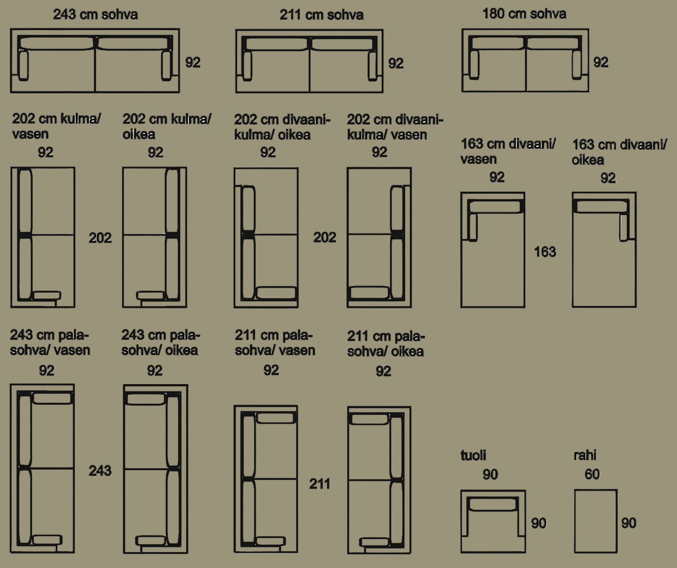 Valmistamme Air-sohvat Hollolassa. Rakenne on kestävä ja verhoilu irrotettava, mikä helpottaa huoltoa ja pidentää sohvan käyttöikää. Mallisto on muunneltava: saatavilla on useita kokoja ja laaja kangasvalikoima.