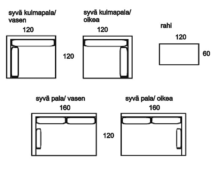 Istuin-, selkä- sekä käsinojatyynyt höyhen+vaahtomuovispagetti täytteiset. Istuintyynyssä ydin vaahtomuovi HR35.